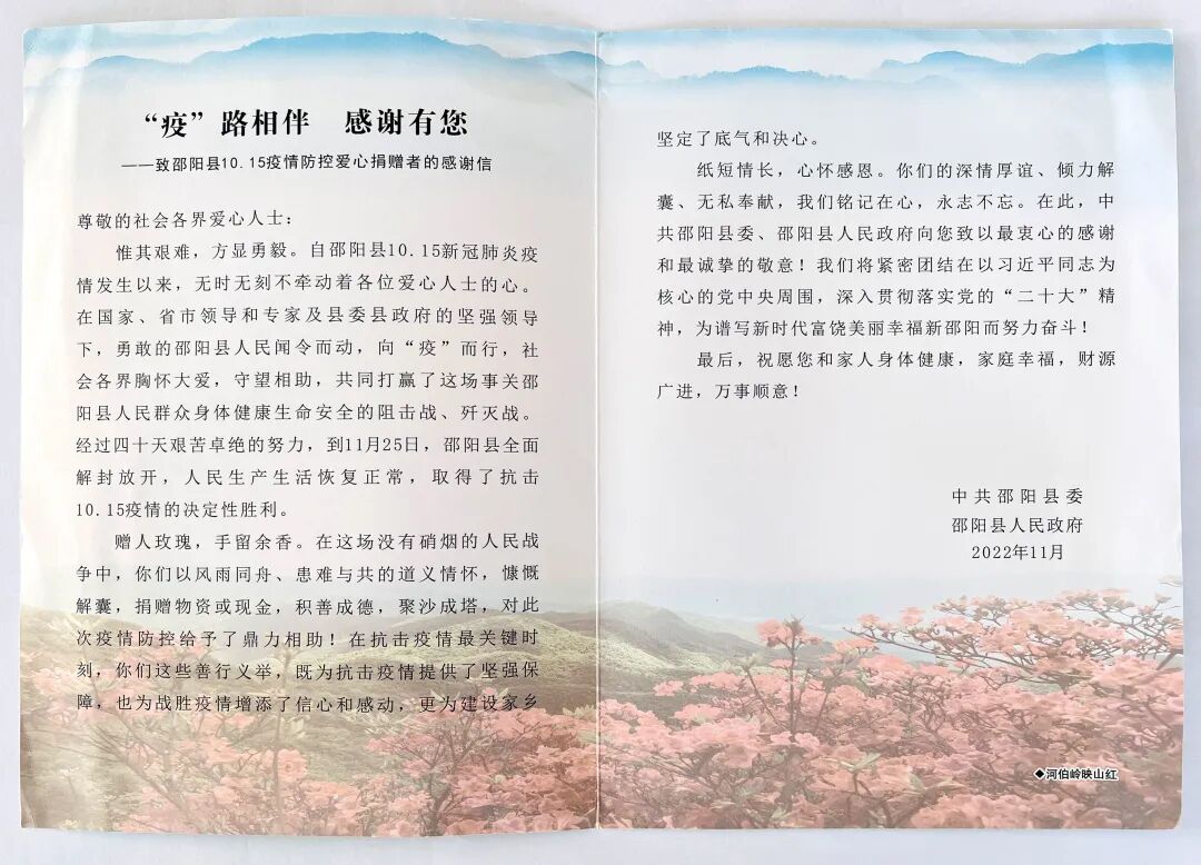 作为有责任、有继续的企业,在企业生长壮大的同时,不忘回馈社会,造福人民。2022年10-11月,邵阳县新冠疫情十分紧急,在918博天堂集团为首的牵头组织下,佛山市湖南邵阳商会齐心协力,短时间内筹集了价值近60万元的抗疫物品和生活物资,分三批次8台大货车迅速运往家乡,支援抗疫;其中918博天堂集团出资现金12万元用于购置抗疫物品。